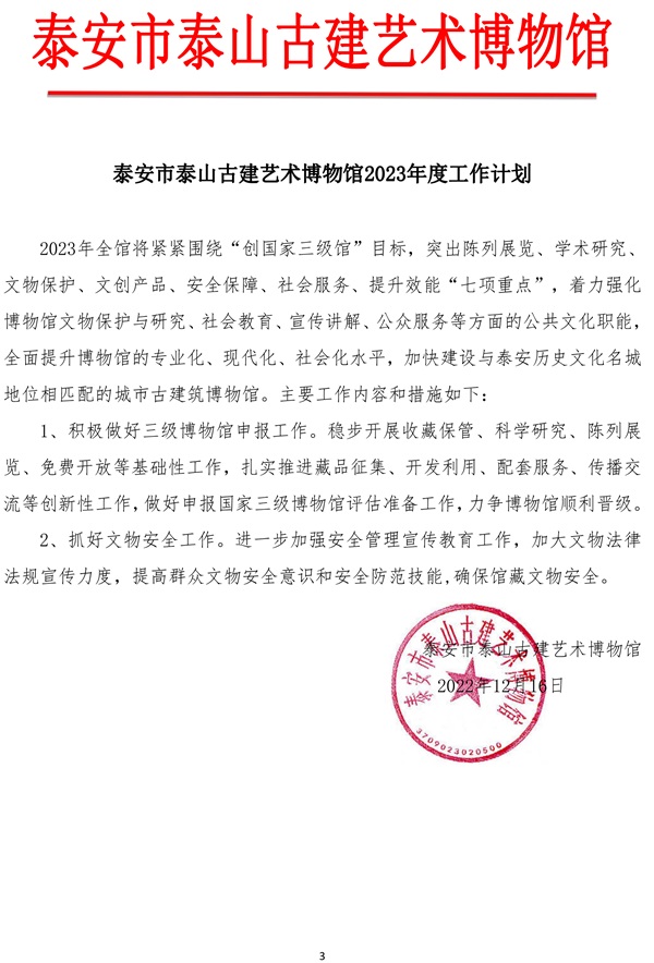 泰安市泰山古建艺术博物馆2023年度工作计划